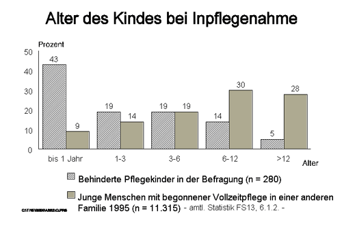 Interessant ist auch das Ergebnis, daß sehr viele Pflegekinder - nämlich 43% - bereits im Säuglingsalter (bis zu einem Jahr) in die Familien gekommen sind (siehe Abbildung 2). Auch hier ist wieder ein Vergleich mit der amtlichen Statistik möglich: hier sagen die Zahlen über begonnene Pflegeverhältnisse, daß nur 9% der Kinder jünger als ein Jahr waren und die Mehrzahl (58%) erst in einem Alter von über 6 Jahren in die Pflegefamilien gekommen ist. Die von den Eltern in dieser Befragung berichteten Pflegeverhältnisse unterscheiden sich deutlich vom ‘Durchschnittspflegeverhältnis’ (Statistisches Bundesamt 1997c, S. 23).