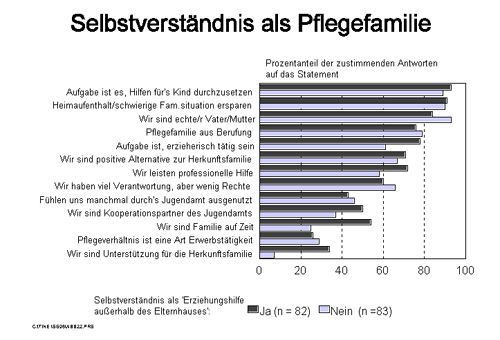 Werden die Pflegefamilien ganz allgemein zu ihrer persönlichen Einschätzung gefragt, ob sie sich als eine solche „Erziehungshilfe außerhalb des Elternhauses“ fühlen, antworten nur 10% mit einem ‘ja, voll und ganz’. Ein ‘nein, gar nicht’ wird dagegen von 29% als Antwort gegeben. Die übrigen Antworten verteilen sich auf die Zwischenkategorien ‘tendenziell ja’ (40%) bzw. ‘tendenziell nein’ (21%), so daß zusammengenommen sowohl für die zustimmende wie auch für die ablehnende Position je 50% zusammen kommen.
