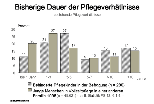 Viele der 281 Pflegekinder sind bereits lange in den Familien untergebracht. Zum Zeitpunkt der Befragung beträgt die durchschnittliche Pflegedauer knapp 6 Jahre, wobei einige Kinder gerade erst in die Familien gekommen sind und andere bereits 20 Jahre dort leben. Verglichen mit der amtlichen Statistik zur Vollzeitpflege (Statistisches Bundesamt 1997b, S. 26) liegt die Dauer der Pflege bei den befragten Familien etwas über dem der Pflegeverhältnisse im allgemeinen (vergl. Abbildung 1). Die Skepsis, die einem Pflegeverhätnis mit behinderten Kindern entgegengebracht wird, ist demnach zumindest vor dem Kriterium ‘Dauerhaftigkeit der Pflegebeziehung’ nicht angebracht.