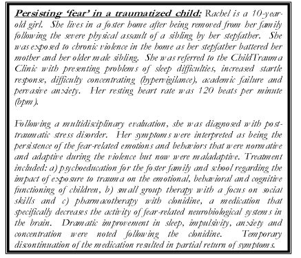 Vorbemerkung: Die folgende Einzelfallstudie stammt aus dem Forschungs- und Behandlungs-Institut ( ChildTrauma Academy) von Bruce Perry. Ein psychisch schwer traumatisiertes Kind erhielt eine Gruppentherapie kombiniert mit Clonidine-Behandlung (hiesiger Markenname: Catapresan). Die Pflegeeltern wurden begleitend beraten. Es traten sehr eindrucksvolle Besserungen ein und deutliche Rückfälle nach zwischenzeitlicher Absetzung des Medikaments. Dürfen wir hoffen? K.E. (Okt. 01)