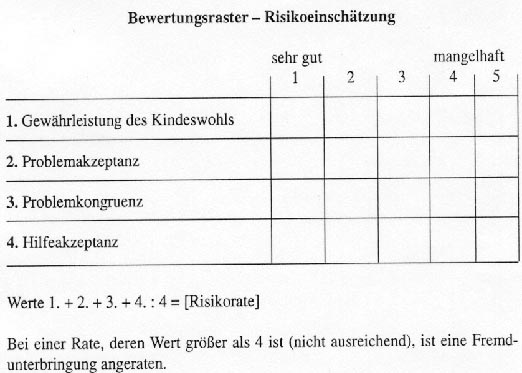 Aber neben dieser defensiven gab es auch eine erfreulich offensive Strategie: die Forderung nach fachlicher Qualifizierung der Jugendamtsmitarbeiter und ihrer Interaktionen, einerseits als bester Schutz der betroffenen Kinder vor zu früher oder zu später Herausnahme, andererseits als bester Schutz der Sozialarbeiter vor strafrechtlicher Haftung. An die Spitze dieses Trends stellte sich Reinhard Wolff von der Alice-Salomon-Fachhochschule Berlin. Er beließ es nicht bei Appellen, sondern brachte einen Set vorbereiteter Arbeitsbögen zur „kritischen Risikoeinschätzung“ ein, die in einer der Arbeitsgruppen praktisch erprobt wurden, z.B. folgende (S. 122):